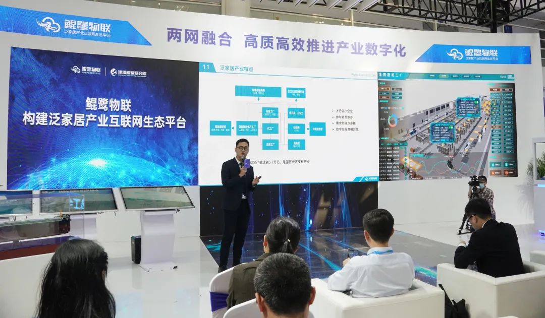 接下来,郭伟鹏详细介绍了如何赋能泛家居产业实现“降本、增效、提质”。他表示,泛家居产业总产值5.7万亿的泛家居产业参与者类型众多、需求痛点多样、数字化程度相对较低,需要构建“产品+服务”分类分级精准定位的产品体系。现场他展示了鲲鹭智能制造整体解决方案,并详细介绍了鲲鹭云盒、云造、云检、“掌上工厂”、数字化诊断咨询、数字孪生等产品和服务在泛家居行业场景的应用价值。